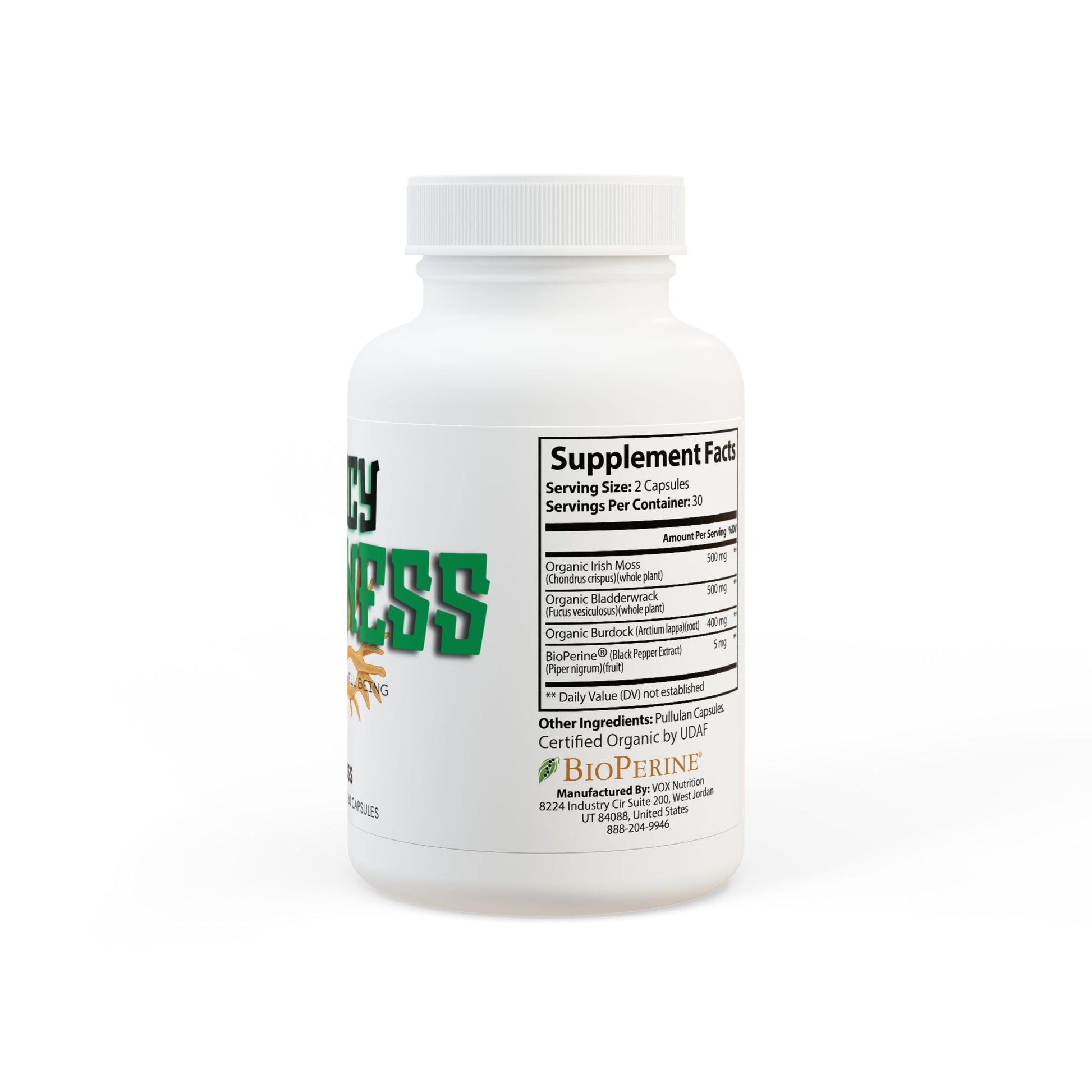 Ingredients: Organic Irish Moss (Chondrus crispus)(whole plant), Organic Burdock (Arctium lappa)(root), Organic Bladderwrack (Fucus vesiculosus)(whole plant), BioPerineĀ® (Black Pepper Extract), (Piper nigrum)(fruit). Other Ingredients: Pullulan Capsules.